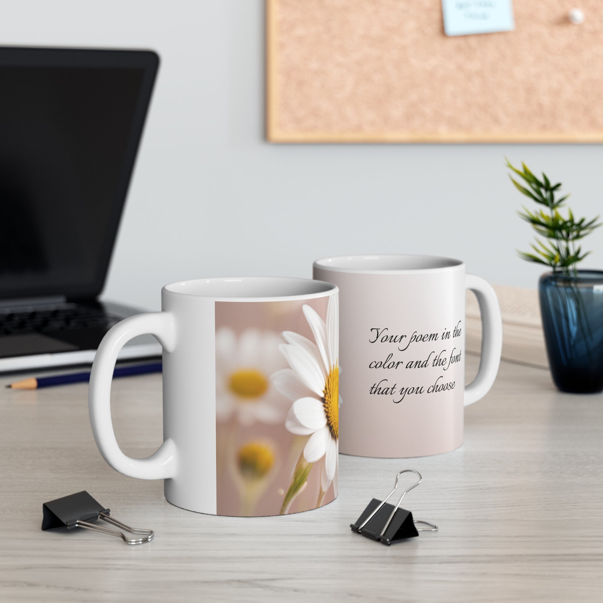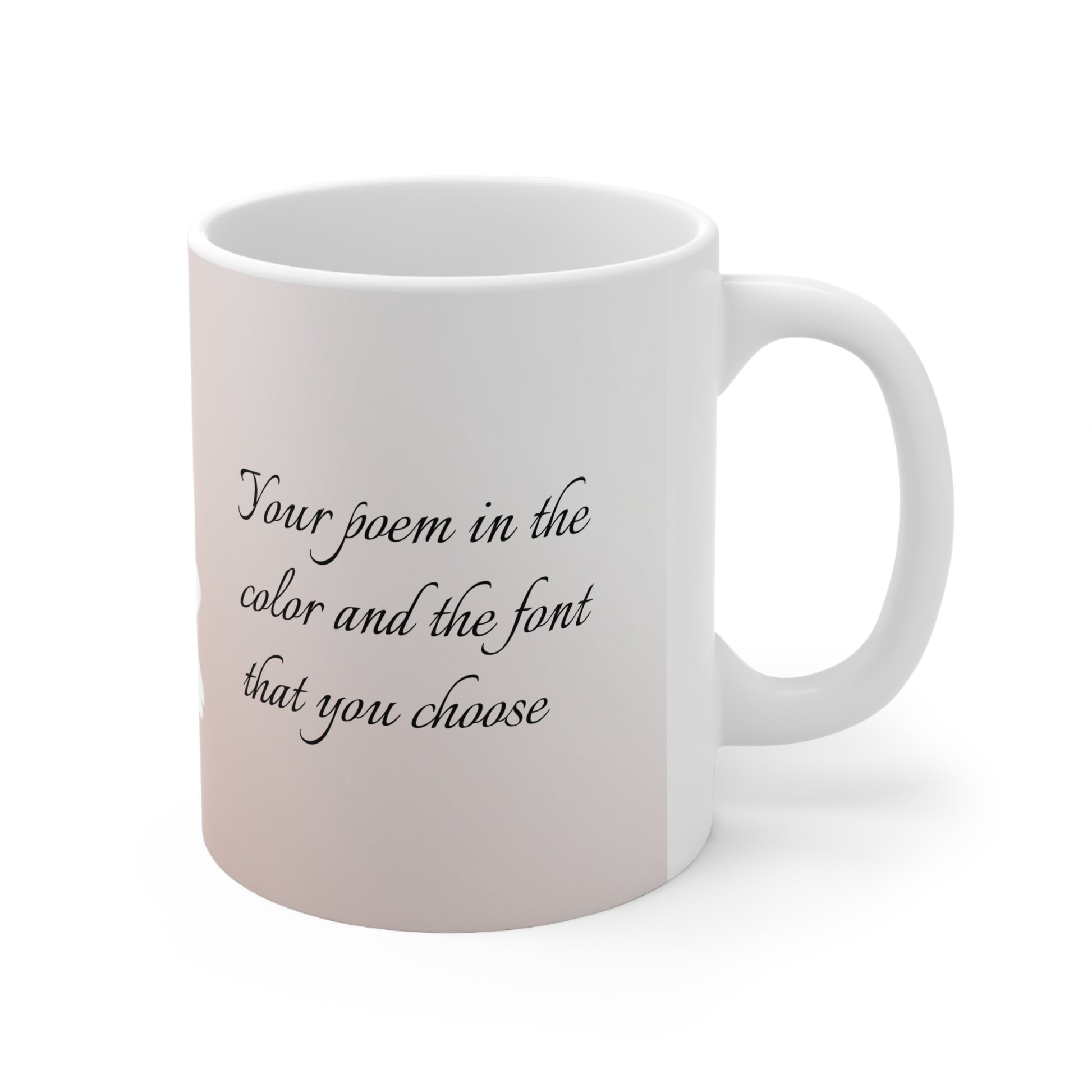 Warm-up with a nice cuppa out of this ceramic coffee mug that features your poem! After you make the purchase we will contact you by email so that you can provide us the details including how you want your mug created. We will customize the mug and provide you up to three edits to ensure that you are completely happy with the finished product.
