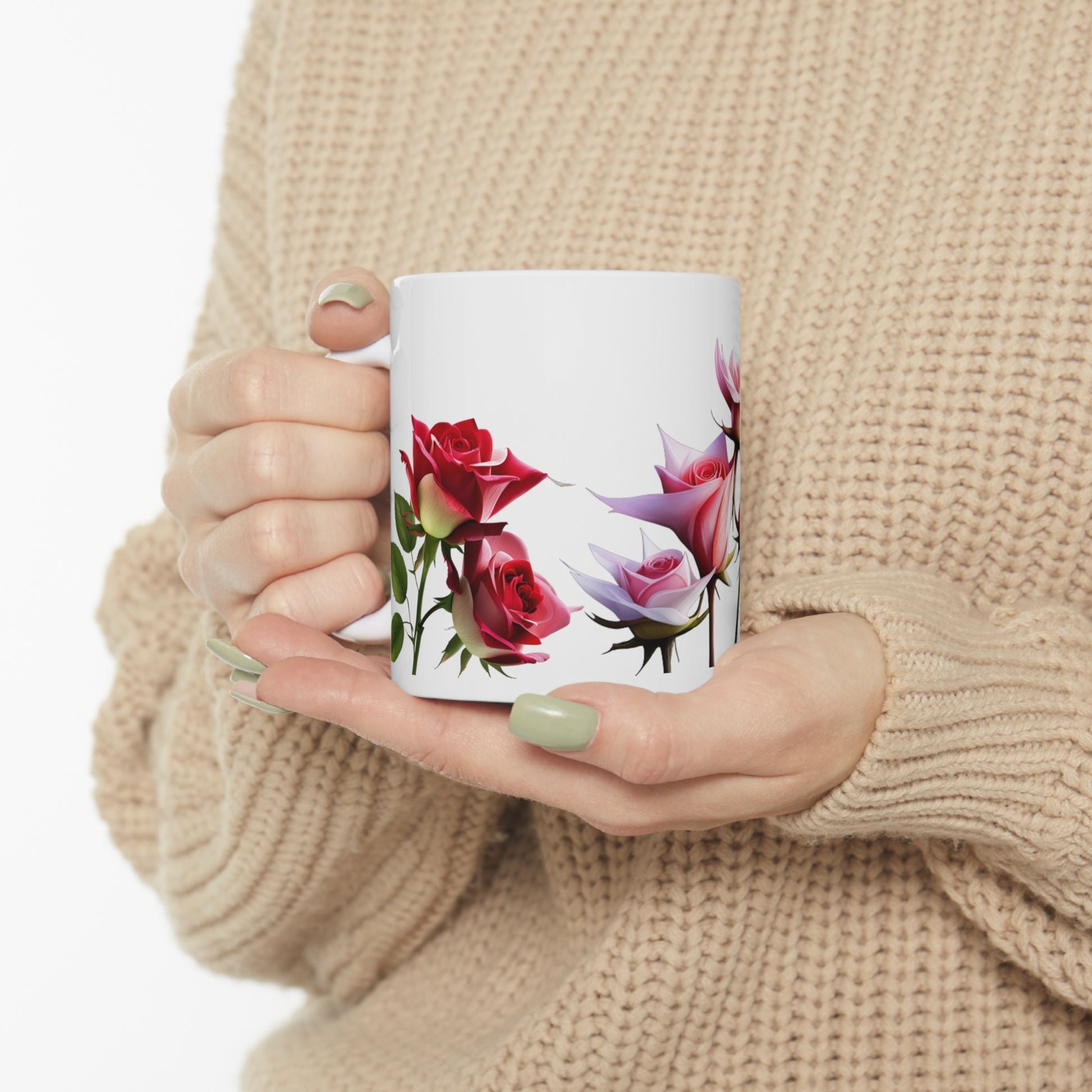 .: These 11oz (0.33 l) mugs are made with durable white ceramic.